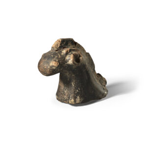 Capfoguer en forma de protomos de boc. En un costat del cap es veu la banya i a l'altre no. En aquest costat sense banya hi ha un forat fet abans de la cocció.